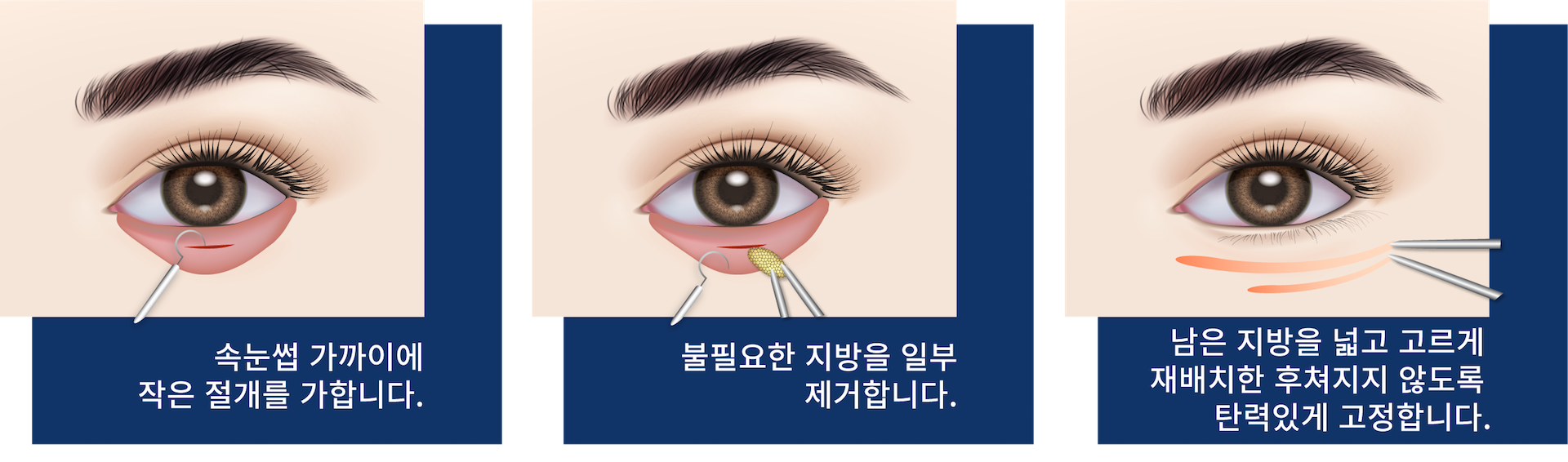 레이저 미세 절개로 결막을 안쪽에서 절개하여 자가지방의 위치를 교정하여주는 수술입니다.