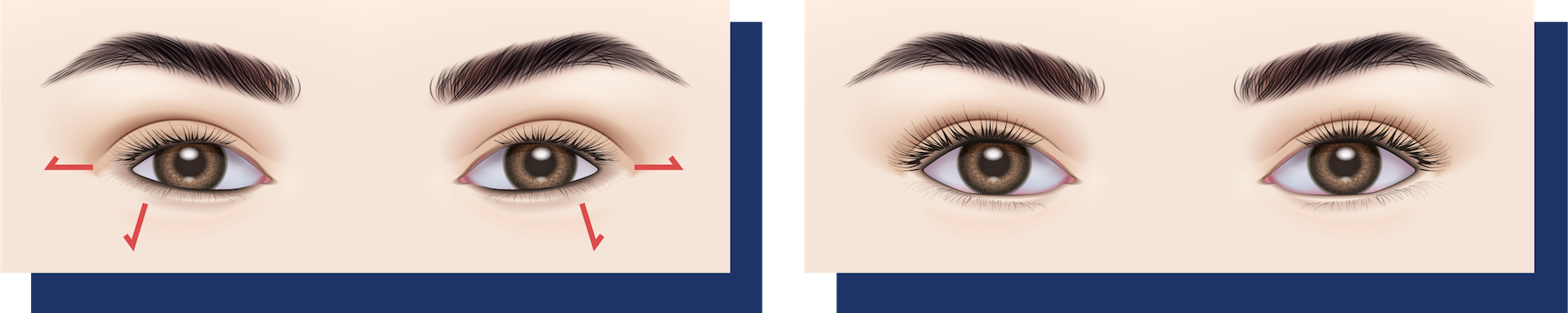 - 눈의 가로 폭이 좁으면서 눈꼬리가 많이 올라가는 경우 눈매가 답답하고 사나워 보이는 인상을 주게 되며, 뒤트임이나 밑트임 어느 한가지만으로 개선하는데 한계가 있습니다.